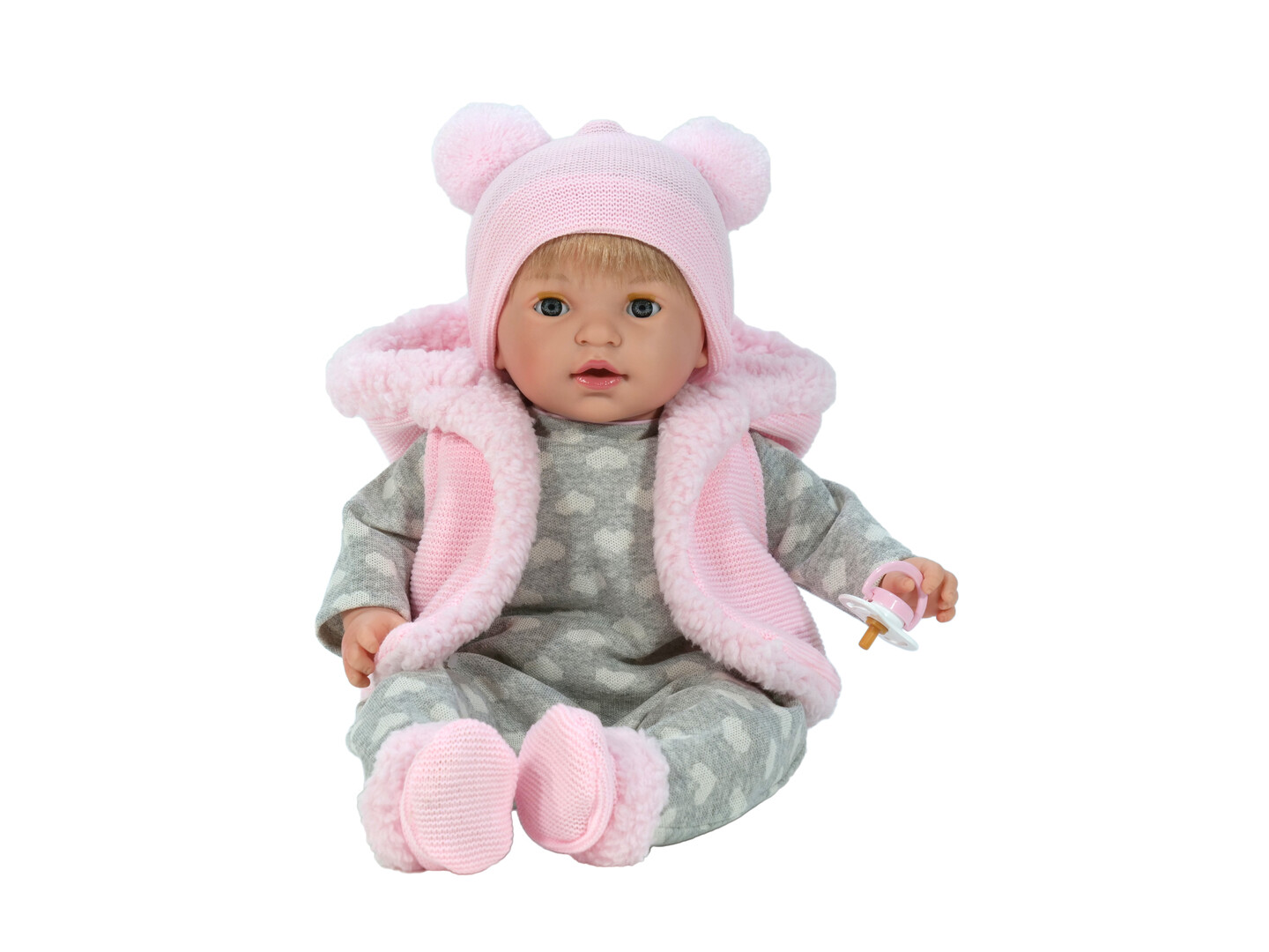 Contenuto: 1 bambola di 32 cm (corpo in tessuto e testa, braccia e gambe in vinile), 1 bloomer, 1 camicia a maniche lunghe, 1 cuffia.