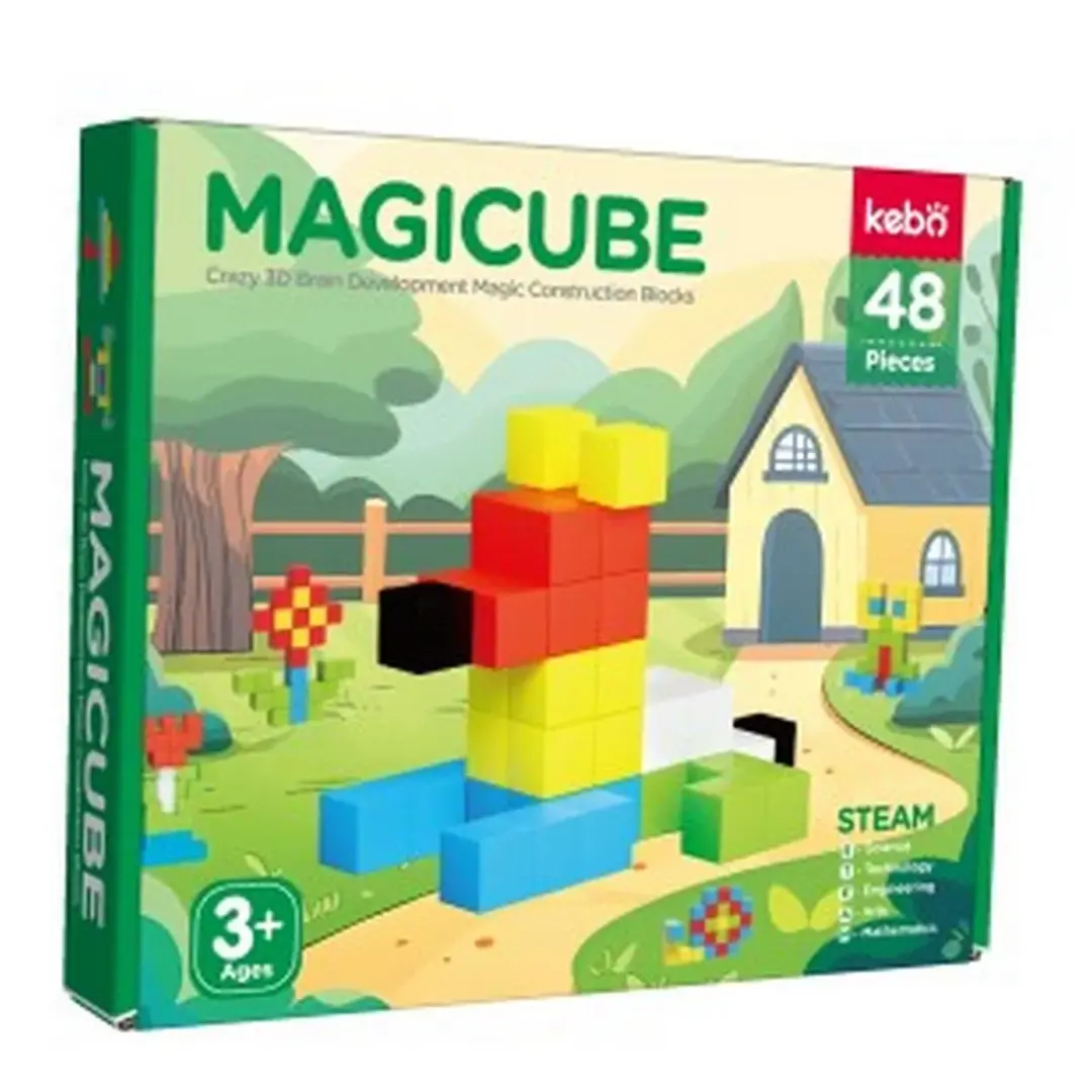 Costruisci in 3D con il set Kebo Magícube da 48 pezzi! Include blocchi magnetici cubici in colori vivaci, perfetti per creare figure, animali e strutture. Ideale per lo sviluppo STEAM, stimola pensiero spaziale e creatività. Sicuro e robusto, perfetto per bambini dai 3 anni in su per un divertimento costruttivo e intuitivo.