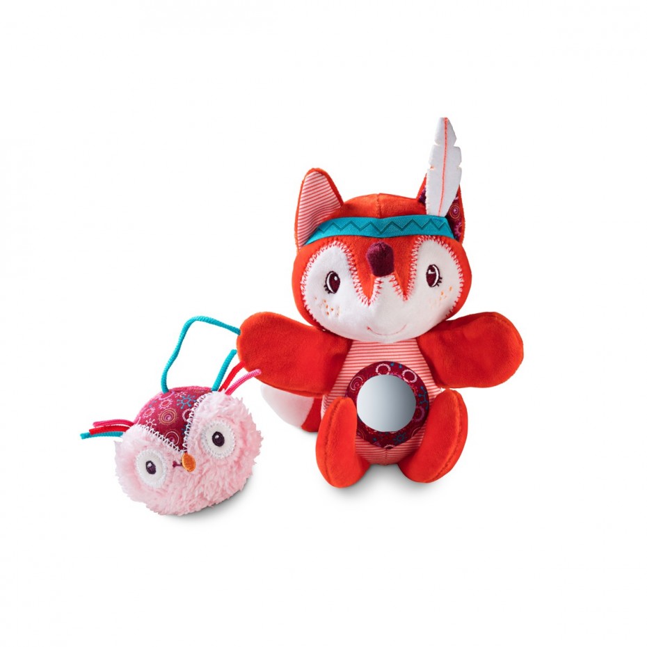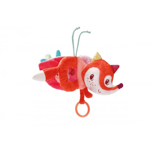Alice, la volpe, si avvolge tutta intorno al passeggino o al seggiolino, con tante attività per stimolare il bambino: specchio, poti poti e piccola campanella!