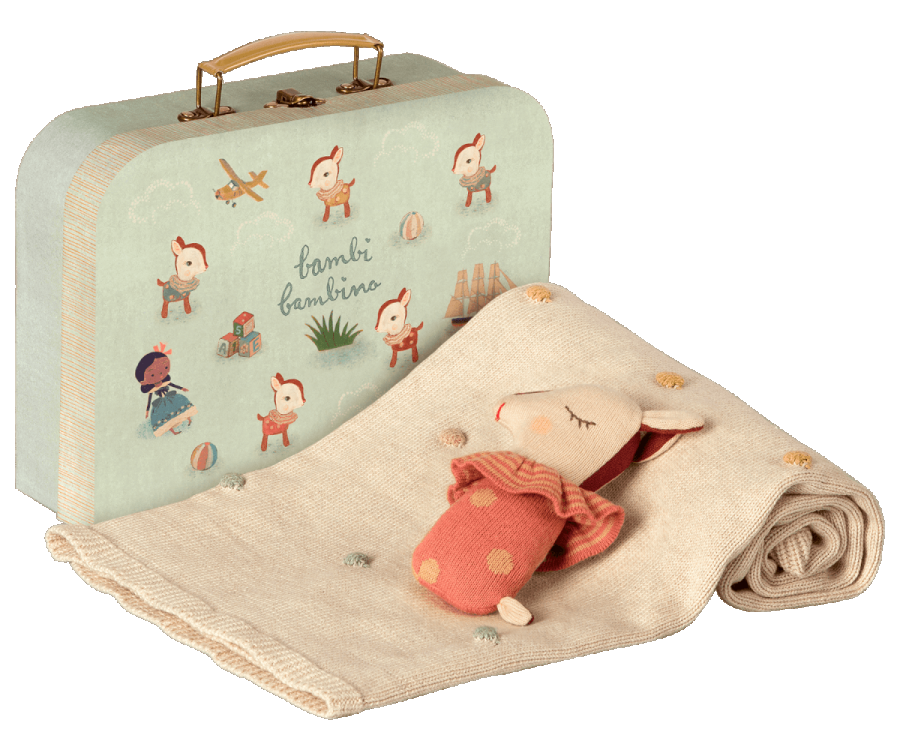 Questo bellissimo set regalo per bambini include un sonaglio Bambi e una morbida coperta lavorata a maglia, entrambi in cotone OEKOTEX. È confezionato in una valigia fatta a mano ben decorata. Coperta 28x36, Sonaglio altezza 6, Valigia 10,4x3,2