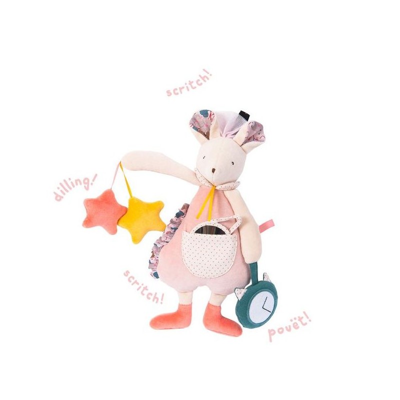 comprende 3 diverse attività: attività sonora con coniglio girevole e campanello, attività visiva con l'orso specchio, attività tattile con volpe frullante legno e silicone.